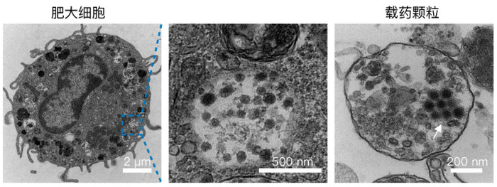 图为装载溶瘤病毒的肥大细胞透射电镜图片(左);细胞内部含有溶瘤病毒的颗粒的放大图(中);经脱颗粒释放到胞外的含有溶瘤病毒的颗粒透射电镜图(右)。(课题组供图)
